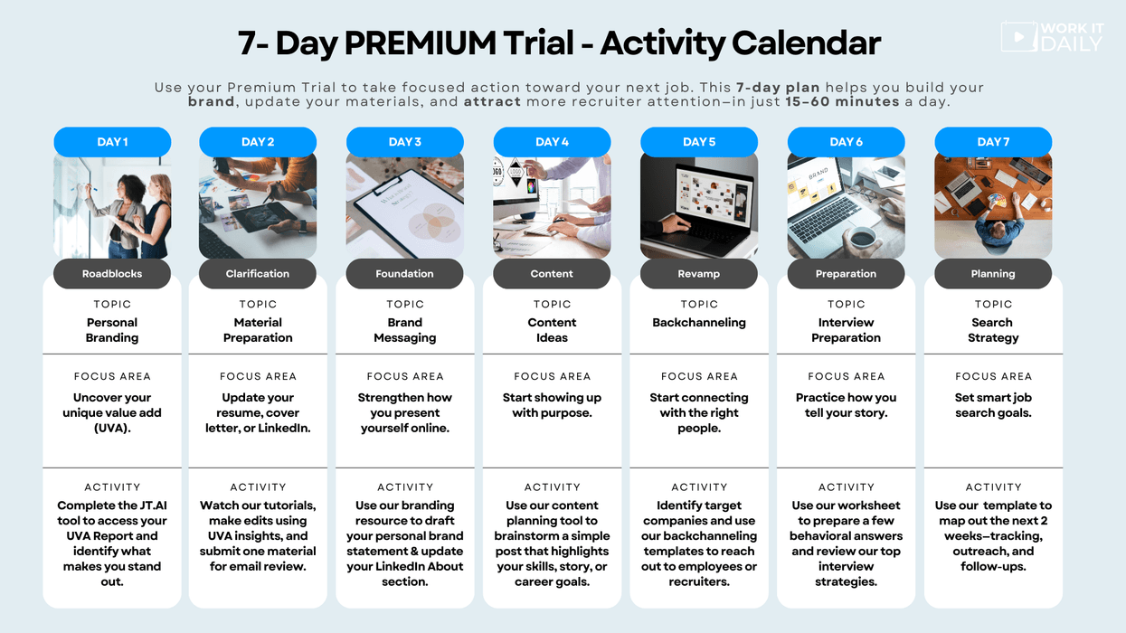 In just 15–60 minutes a day, you’ll build your personal brand, update your materials, and attract more recruiter attention. Here’s exactly what you can accomplish each day of your free trial: